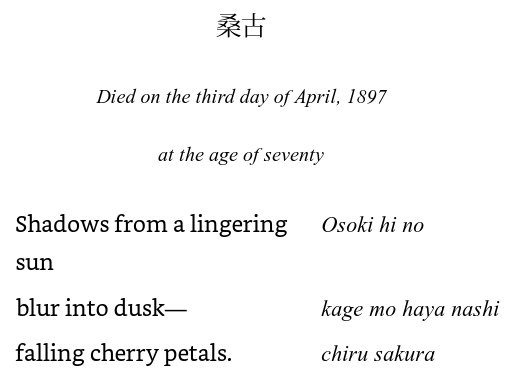 It is considered to be an East Asian custom especially in Japan since the Middle Ages. Death poem by Kuroki Hiroshi. Jisei were most often written as Japanese-style poetry waka with the most popular types being the well-known haiku. Lovely and very much in keeping with classic haiku.