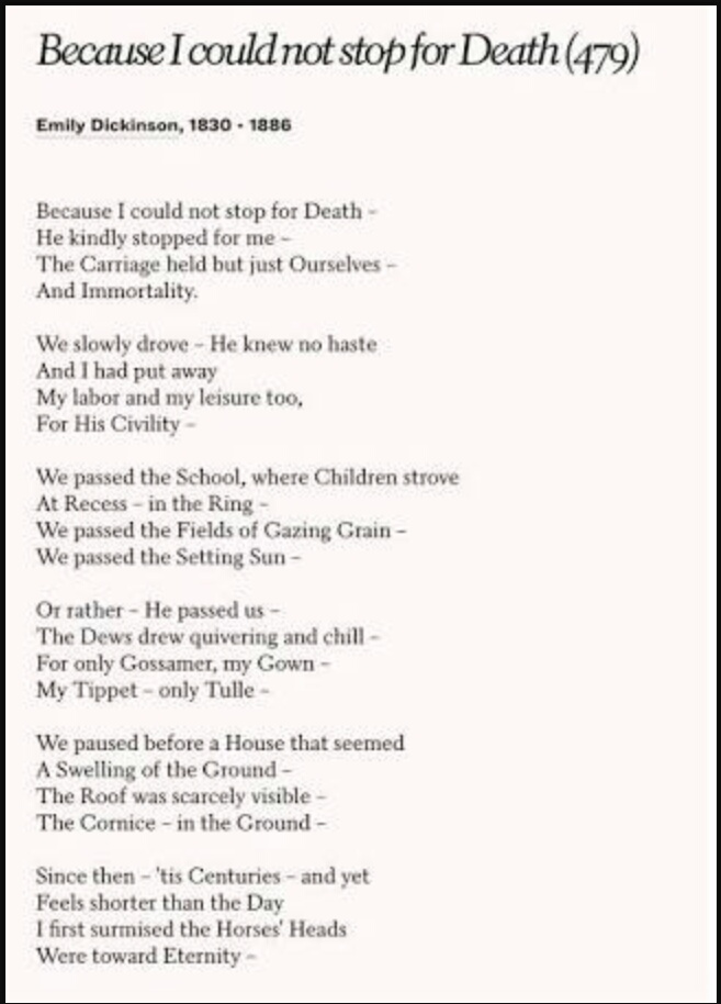 Below is a letter that Dickinson sent to her sister-in-law Susan Gilbert. Is a short poem by American poet Emily Dickinson who wrote during the mid-19th century though most of her poems were not published until the 1890s after Dickinson had died. One of Dickinsons most quoted poems Because I could not stop for Death is based on the speakers journey from the earth to the grave. The poem begins with the speaker telling the reader that she doesnt know why she is the way she is.