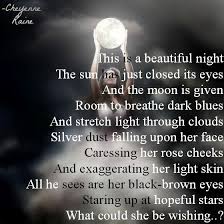 The poems final image of dark listening to dark is especially eye-catching. Her visage in the moonlight Reminded me of Prune Blight. 1 min read 0. Her gracefulness in moonlight Was nothing like balloon flight.
